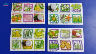 Cet outil contient 5 planches de loto et 30 boîtes d'odeurs naturelles : eucalyptus, melon, vanille, champignon, muguet, violette, lavande, noix de coco, cassis, savon, miel…