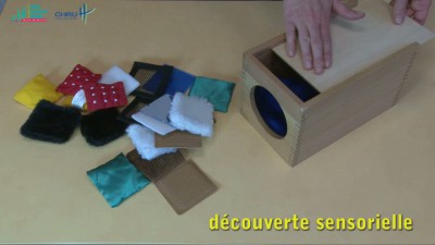 Nota: Si la personne manque d'initiative, il peut-être nécessaire de l'accompagner physiquement vers la découverte de l'ensemble. Pour cela, on peut avec douceur, prendre la main de la personne et la diriger vers les carrés, ou bien diriger les carrés vers sa main, selon ses réactions.