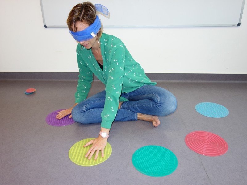 Exploration tactile avec les pieds et/ou les mains des différentes plaques en gardant les yeux ouverts.